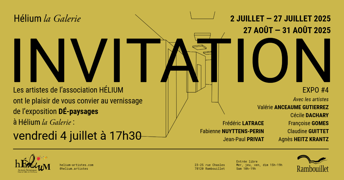 *  L’association Hélium, créée en 2004 et comptant aujourd’hui 132 artistes membres résidant et/ou exerçant sur le territoire du Parc naturel régional de la Haute Vallée de Chevreuse (Yvelines et Essonne), a pour vocation de favoriser les rencontres autour de l’art, entre les artistes et le public.